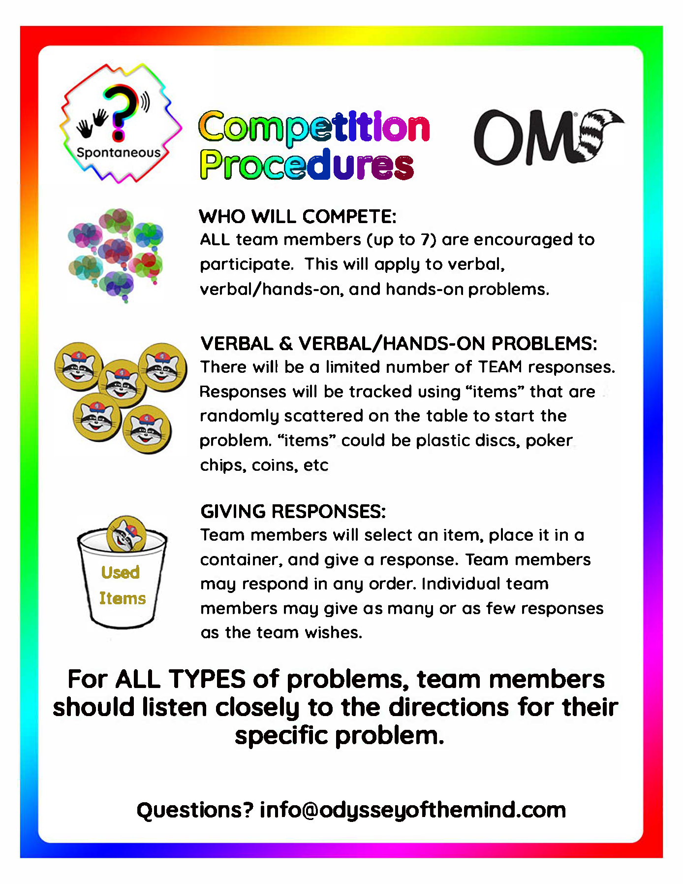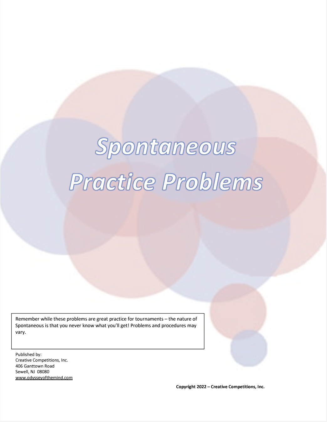 NOTE: The problems in the archive and on most websites you find are written for FIVE team members to participate. Odyssey now encourages all team members to participate. No one sits out. Teams are given tokens (usually 35) to use for responses. Team members can answer in order, but the more strategic approach would be to provide your most creative answers first before time runs out. Please keep this in mind and modify when using these practice problems.